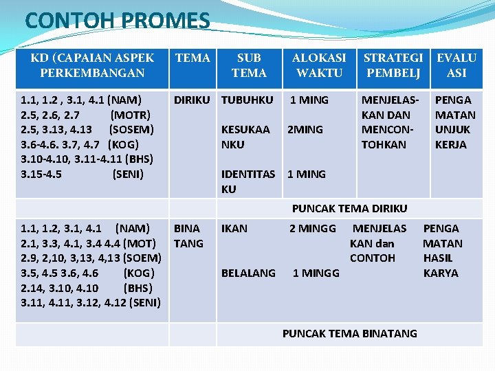 Dengan penyusunan prota secara benar maka guru / pendidik akan lebih mudah dalam menyusun dan menentukan alokasi waktu yang berada di dalam promes. Menetapkan piliha n jenis kurikulum ktsp/k13 pada setiap tingkat. Bentuk satuan kegiatan mingguan (skm) model pembelajaran kelompok. Dengan alokasi waktu 40 menit per jam pembelajaran tatap muka. Rencana program semester paud (promes = prosem) adalah program rencana pembelajaran paud yang berisi daftar tema satu semester dan alokasi waktu setiap tema.