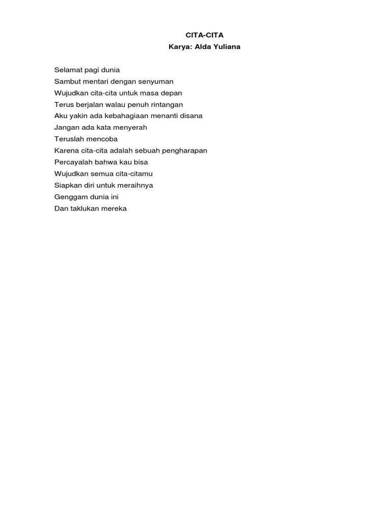 Puisi Tentang Cita Citaku 2 Bait / 3 - Contoh puisi cita citaku menjadi polisi berbakti.. Kumpulan puisi cita citaku menjadi guru, dokter, tentara, polisi, polwan, pilot, artiset, koki dll. Apapun itu, insya allah, semuanya terkabul ya,. Puisi tentang cita citaku ingin menjadi guru 2. Contoh puisi cita citaku menjadi polisi berbakti. Berapakah jumlah bait yang terdapat pada puisi tersebut?